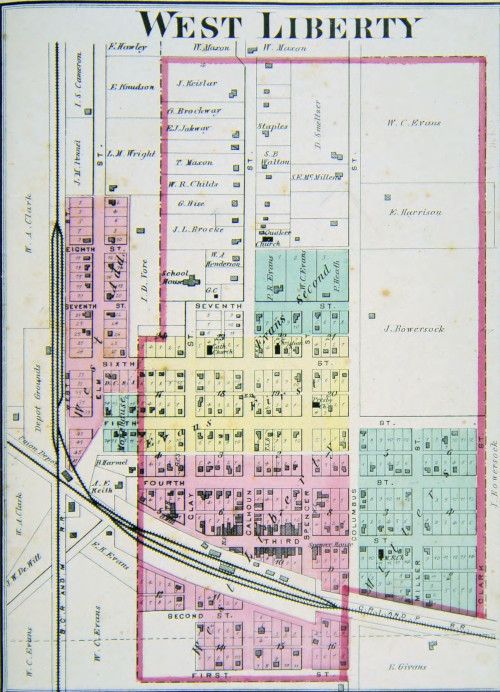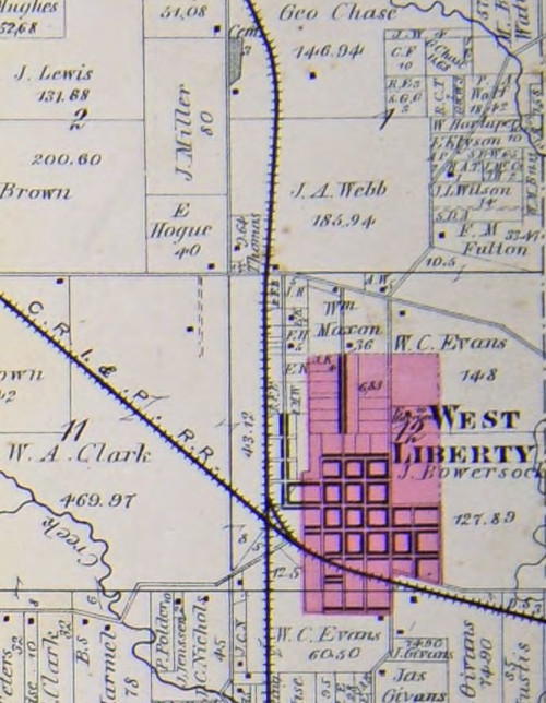 The City of West Liberty is located in Wapsipinoc Township, Muscatine County. It is the name of two different townsites in the township. West Liberty was founded in 1838 by Simon Bagely, who ran the first post office by the name West Liberty. The name was reportedly chosen for a place “back east.” The old town, which was surveyed and platted when it was established, had been located “a little northwest” of the 1911 extent of the town. This may be at about the northwestern edge of the present City of West Liberty, however the location is not recorded in the available county plat maps and atlases. North Prairie Cemetery is about 1.25 miles north of the present northwest corner of the city or 2.10 miles north of the railway. It’s first burial was in 1838.