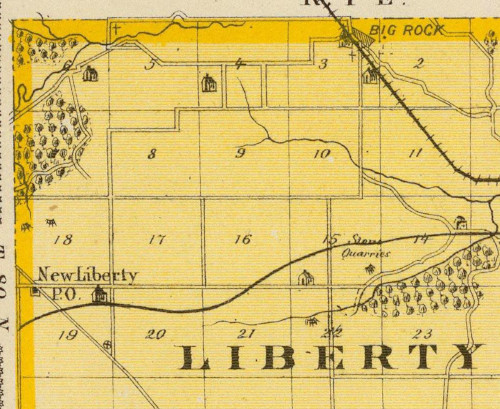 The further possibility for movements of the town, resulting in the name New Liberty, is intriguing. The Big Rock Cemetery has an alternate name of Old Liberty Cemetery. The townsite of Big Rock exists as an unincorporated place in 2021. This village was founded in 1855, well before New Liberty, and had its own rail connection on the Davenport and St. Paul Railroad by 1875. The 1882 county history mentions that the townsite had been the location of an earlier settlement. Perhaps the earlier settlement at Big Rock was the original Liberty of Liberty Township.