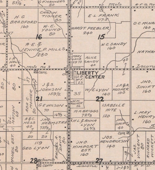 Liberty Center is an unincorporated community in the southwest corner of Section 15 and northwest corner of Section 22, Liberty Township, Warren County. It is indeed located in the center of the township. A post office was established in 1867 and the town was platted in 1875. In the 1872 county atlas, Liberty Center consisted of eight lots at the southeast and northeast corner of the junction of two county roads. A post office was located there at the time and continues to 2021. A bank opened in 1907. In 1915, the town had expanded north and a church and cemetery were located nearby to the west. The population was seventy-four. North Liberty School was located two miles north, in the northern area of the township. Liberty Center Cemetery is located one-half mile west of the town. The 1908 county history states the name of Liberty Township in Warren County was selected for the abolitionist views of its early residents. There are also Liberty Centers in Ohio and many Iowa abolitionists moved to the state from Indiana and Ohio.