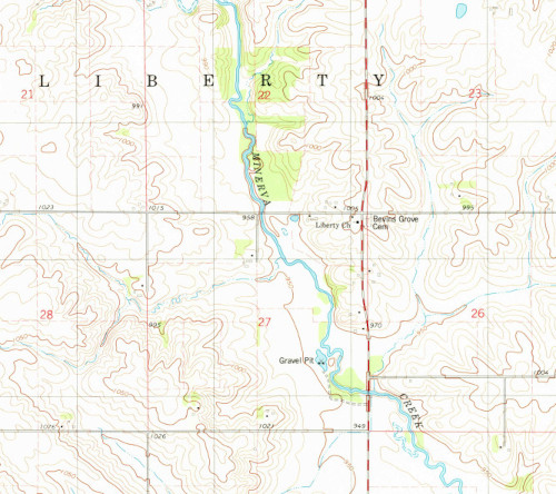 The 1878 county history states that a plat for the town of Liberty in Marshall County was made in 1857. The town was located in the northeast corner of section 27, Liberty Township. A post office was established at that location from 1857 to 1864. The community appears to have never grown substantially and only remains as a church that was listed in the 1912 county history with the affiliation of the Religious Society of Friends (Quakers). The nearby vicinity later became Bevins Grove, which was the name of the post office in 1875 and was recorded in 1878 as an “unsurveyed hamlet.” Such settlements were once more common across Iowa.
