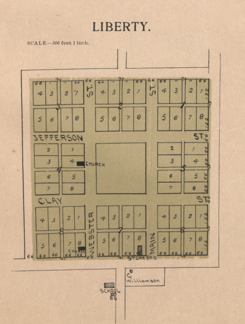 The town of Liberty, Clark County was platted in 1855. The town no longer exists. Liberty straddled the section-corner of Sections 5, 6, 7 and 8 of Liberty Township. A 1902 plat map shows the town as having a central square with eight blocks surrounding it. Each block had eight lots. Three buildings were labeled. These included two churches and a general store. The post office was in the same building as the store. The occupied lots were Lot 4, Block 4; Lot 8, Block 8 and the post office in Lot 8, Block 7. Liberty Cemetery is about a quarter mile south of the townsite.