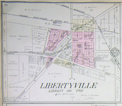 Libertyville is a city located at the section-corner of Sections 7, 8, 17, and 18 of Liberty Township in Jefferson County. It was platted in 1845 in an area previously known as The Colony. The town was located on the Iowaville Road and Agency Road, two territorial period roads. It was situated on the Chicago, Rock Island, and Pacific railroad as well as the Chicago, Burlington & Quincy railroad. The original town plat consisted of two blocks. By 1909, there were five land additions. In addition to the post office, there was a hotel, a bank, two train depots, an elevator, a school and two public squares. The hotel was actually outside of the platted limits of the town, as was the CB&Q depot and elevator. The reader can draw their own conclusions about any liberties potentially taken here.