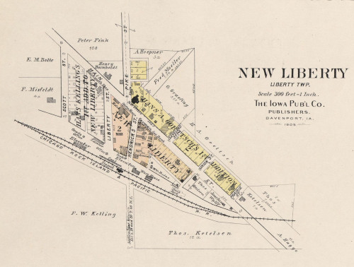 The City of New Liberty is a small incorporated area located in the south half of Sections 19 and 20, Liberty Township, Scott County. The community, like most of Scott County, was largely Prussian and German immigrants. In this instance, many were from Holstein. Jacob Heller was the first Euro-American to settle in Liberty Township in 1837. But New Liberty wasn’t founded until much later, apparently when the Burlington, Cedar Rapids & Northern railroad was built. The town was incorporated in 1909. George Lueders was the first mayor and otherwise prominent resident.