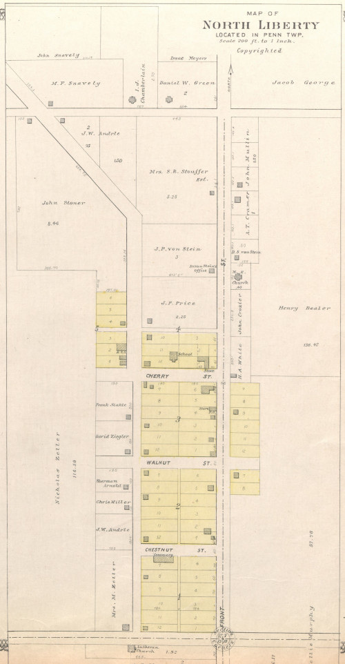 South Liberty was a village located in Section 17, Liberty Township, Johnson County. This is about two and quarter miles west and a half mile north of Hills. Liberty Township was organized in 1846. Vincent Gross platted South Liberty in either 1856 or 1857 at the location of the Bon Accord Post Office. Gross was a Frenchman whose father fought in the French imperial army under Napoleon for twelve years. The atlas of Johnson County from 1900 shows South Liberty to consisted of four blocks with eight lots each.