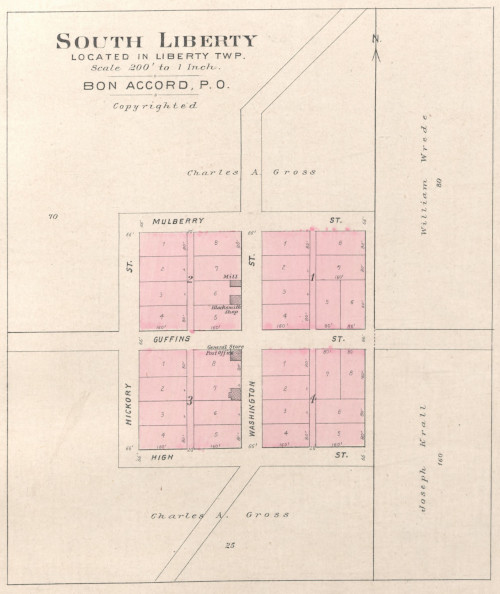The Bon Accord post office and general store were located in a building on Lot 8, Block 3 at the southeast corner of Guffins and Washington Streets. A mill and a separate building for a blacksmith shop were located in Lot 6, Block 2 facing Washington Street. A fourth unnamed building was shown in the lot south of the general store and post office. That might have been a saddle and harness shop in 1882. In that year, Charles Rede was the general store owner. The Bon Accord post office was in service from 1859 to 1897, and then it was known as South Liberty until sometime before 1912 when the post office was reported abandoned. South Liberty continued to be shown on plats until about 1939, but 1930s aerial photos indicate the village was entirely gone by that point.