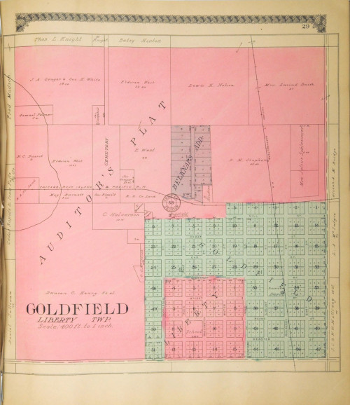 Wright County. Glenwood Cemetery, Goldfield Cemetery, or Liberty Township Cemetery. Liberty Township. The cemetery is currently located in the northwest quarter of Section 33 along a north south local road now known as Mill Street. The town of Goldfield is located to the southwest of the cemetery. Goldfield is shown on the 1875 Andreas Atlas, and in 1904 northern extension into the NE quarter of Section 33 is shown. By 1930, the cemetery was included in Goldfied outlots. Today the incorporated boundary of Goldfield includes the cemetery.