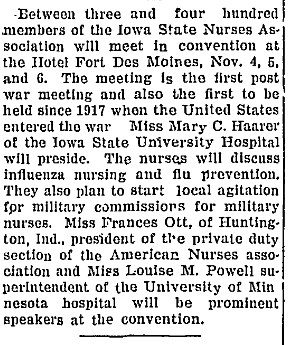 To close, here is an event notice for the Iowa State Nurses Association that was to be led by Mary C. Haarer, Iowa State University Hospital, in 1919. Other common names of the hospital were State University Hospital and University Hospital. (Iowa City Republican, October 13, 1919, page 10)