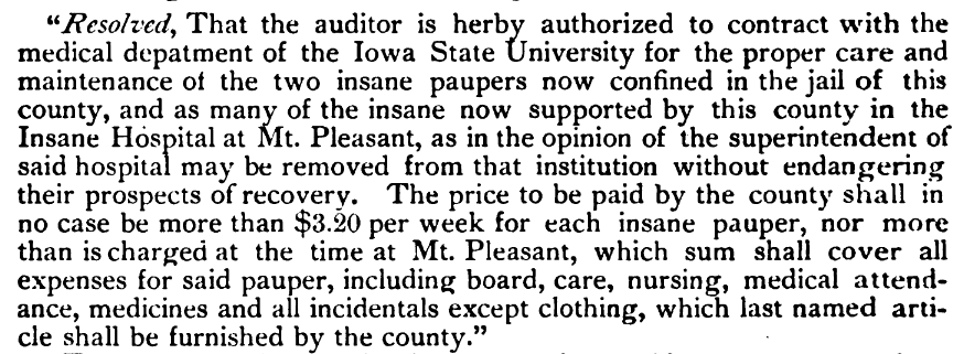 In 1873, Drs. J. C. Shrader and E. F. Clapp, two faculty members in the Medical Department at the University of Iowa, now the Carver College of Medicine, submitted a resolution to the County Board of Supervisors to provide mental healthcare to indigent individuals that had been jailed or were inmates at the state asylum in Mt. Pleasant. They proposed the County should fund the treatment of the individuals at the hospital instead of funding their imprisonment. The hospital was just opened. It was operated by the physicians of the Medical Department at the state university and the Sisters of Mercy. The mother house was Mercy Hospital in Davenport. Although there were several building changes, this is now the University of Iowa Hospitals and Clinics, which maintains a statewide presence. A nursing program was established in the 1896–1897 academic year.