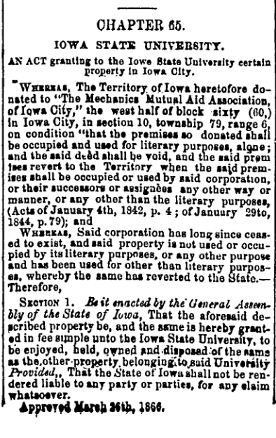Next, the term Iowa State University appears in an 1866 Iowa law where the state legislature gave the Mechanics Academy building to the university. (Iowa City Republican, July 18, 1866, p. 1)