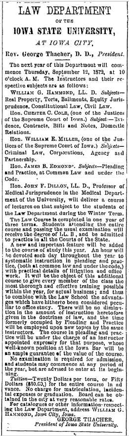 A notice for the Iowa State Law Department, now The University of Iowa College of Law, was printed in 1872 (Iowa City Republican, July 31, 1872, p. 2)