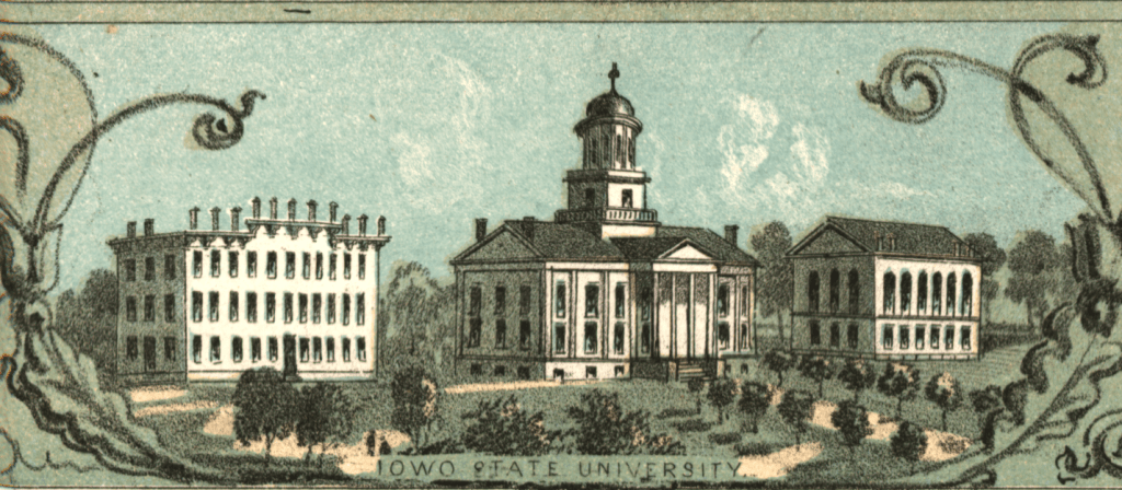 First up is a lithograph print of the state university campus that was made for the 1865–1866 general catalog. Note the title, Iowa State University, rendered in Spencerian Script at the bottom of the image.
