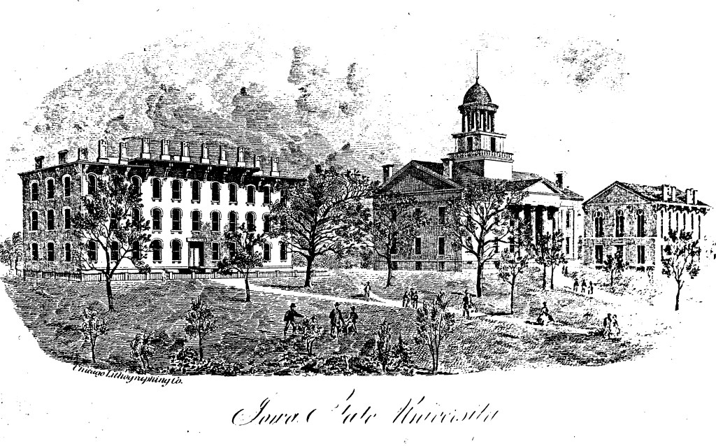 The university appears in artwork in the border of the 1868 Bird’s Eye Map of Iowa City, Iowa. (Iowa is clearly misspelled, but it would ruin your day to have to remake the entire plate for this very large lithograph after a simple phonetic spelling error.)