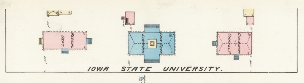 The name Iowa State University reached New York on a fire insurance map of Iowa City made there in 1883. This particular map of the campus was not quite as complete as others that came later, but for this one, the official name give is Iowa State. State University of Iowa appears on most of the maps.