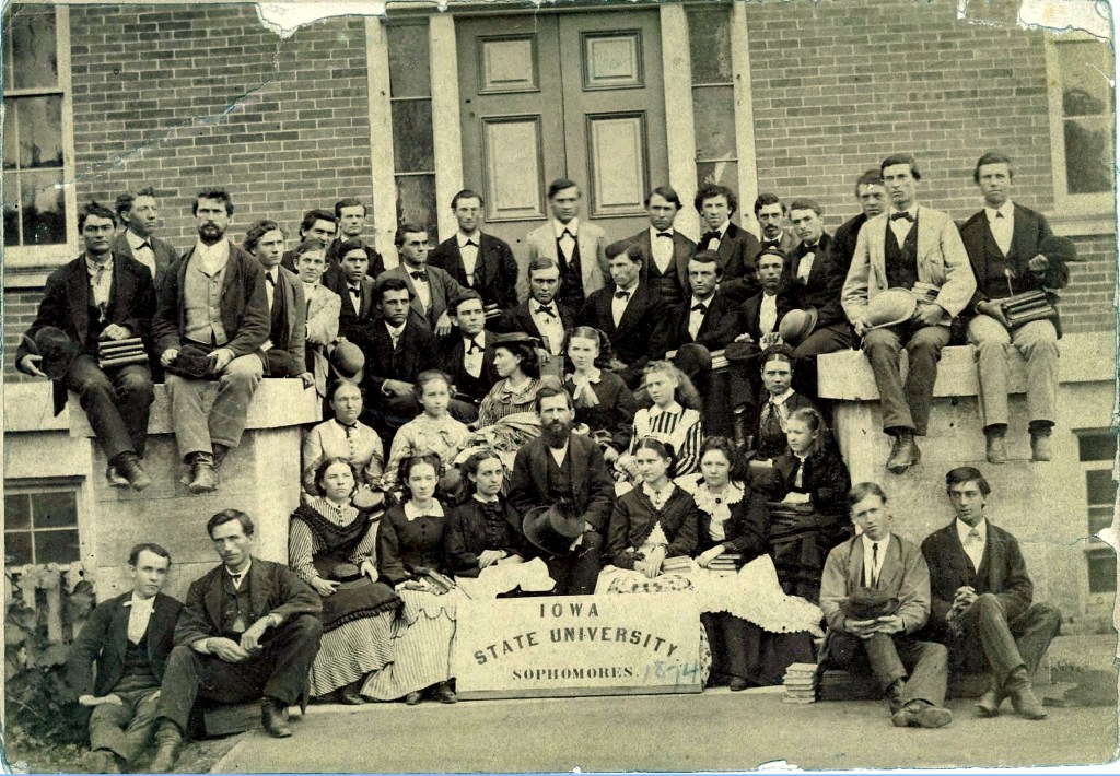 The old North Hall, which had the second university library, a non-denominational chapel, the first science department, and women’s lavatory was a frequent backdrop for class photos in the 1870s. There are some class photos from 1874 on the steps of the old North Hall building that proudly state Iowa State. Here is one.