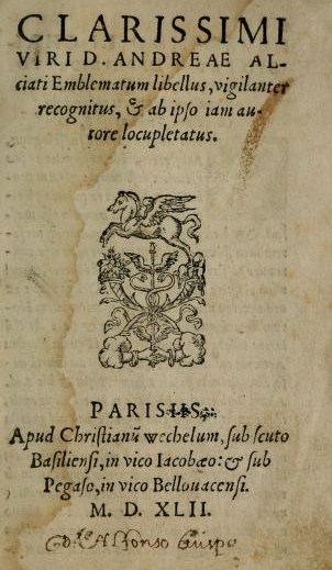 Another example is from twenty years later. It also uses the declarative period convention. The book is commonly known as Emblamata. A translation of the title is given as Andrea Alciato’s Little Book of Emblems and contains a number of poems in Latin presented with emblems printed with woodblocks. Again, each block of text on the cover has a period at the end.