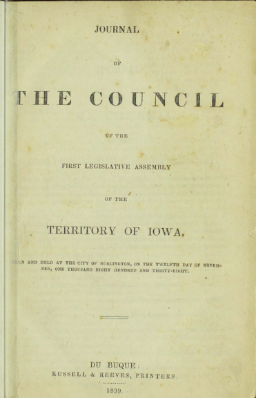About three hundred years later in Iowa, Long titles were still common while construction of the Old Capitol building was in process. For example, the first official publications of the territory used the same format. The title of the journal for Iowa’s Legislative Council reads, Journal of the Council of the First Legislative Assembly of the Territory of Iowa, Begun and Held at the City of Burlington, on the Twelfth Day of November, One Thousand Eight Hundred and Thirty-Eight. The printer information is provided as “Dubuque: Russell & Reeves, Printers. 1839. ” with the final period included. Note the use of periods in the title, after the publisher name, and after the date. The Journal served as a form of minutes and record of things such as committee assignments, legislative actions, and directives. The Council was the upper house of the legislature.