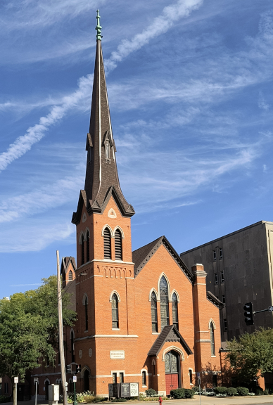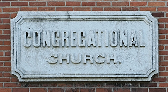 An existing building has another example of a full stop. The First Congregational Church building was built at the corner of Clinton Street at Jefferson Street in 1868, which is well after the main phase of construction at the Old Capitol was completed. A name plaque reads “First Congregational Church. ” The inscription on the date plaque reads “Erected A.D. 1868. ” and includes the full stop format. Thanks go to Erika Bethke for pointing this one out. The location of the name plaque is visible on the front face of the building on the first floor of the tower. Other inscriptions are on plaques slightly higher and on the left or north face of the tower.