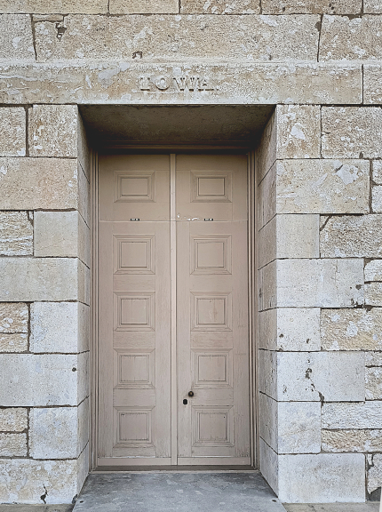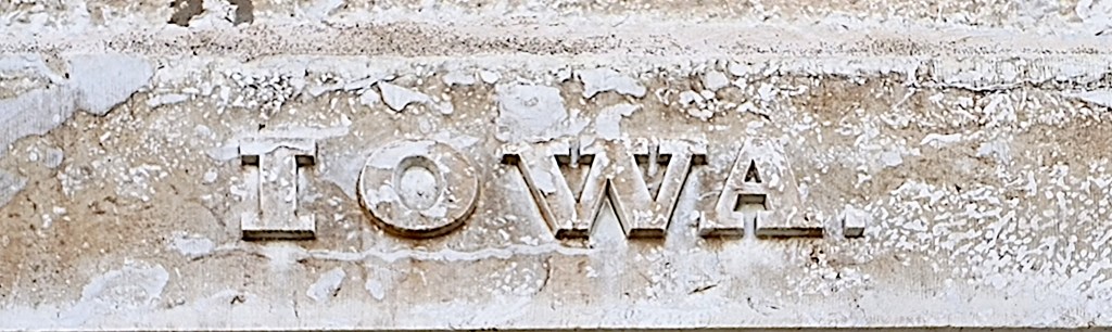 Old Capitol was built to be the seat of government of the Territory of Iowa and was the first capitol of the State of Iowa. It is now a museum that is part of the University of Iowa Pentacrest Museums. The simple inscription reading “I O W A . ” was carved in relief on two large pieces of Middle Devonian Age limestone sourced from nearby quarries and set as lintels on the east and west main entrances of the building. The period after the name had made me curious for a long time and I had decided I would research this topic further, but I didn’t move forward with it until this spring when I was prompted by Erika Bethke, an intern working with Carolina Kaufmann at the University of Iowa Pentacrest Museums, who asked if there was a reason for the dot at the end of the inscriptions on Old Capitol.