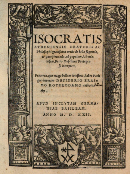 The first is a translation of an oration made by Isocrates against the Sophists. It was published in 1513. There are periods after each line, including title, publisher, and date.