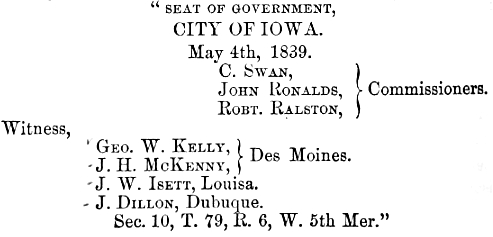 “Seat of Government, City of Iowa. May 4th, 1839. C. Swan, John Ronalds, Robt. Ralston,: Commissioners. Witness, Geo. W. Kelly, J.H. McKenney,: Des Moines. J.W. Islett, Louisa. J. Dillon, Dubuque. Sec. 10, T. 79, R. 6, W. 5th Mer.”