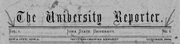 As another example of the terminal dot in common printing, let’s take a look at the masthead of the first year of the University Reporter, a forerunner to the Daily Iowan that ran from 1868 to 1879. It and other titles were published by the University with student writers. The masthead continued to use the declarative periods throughout its run and the convention continued with the run that followed, which was named the Vidette–Reporter. Every Element is followed by a period from title, to place of publication, the name of the university, the motto, volume number, issue number, and date.