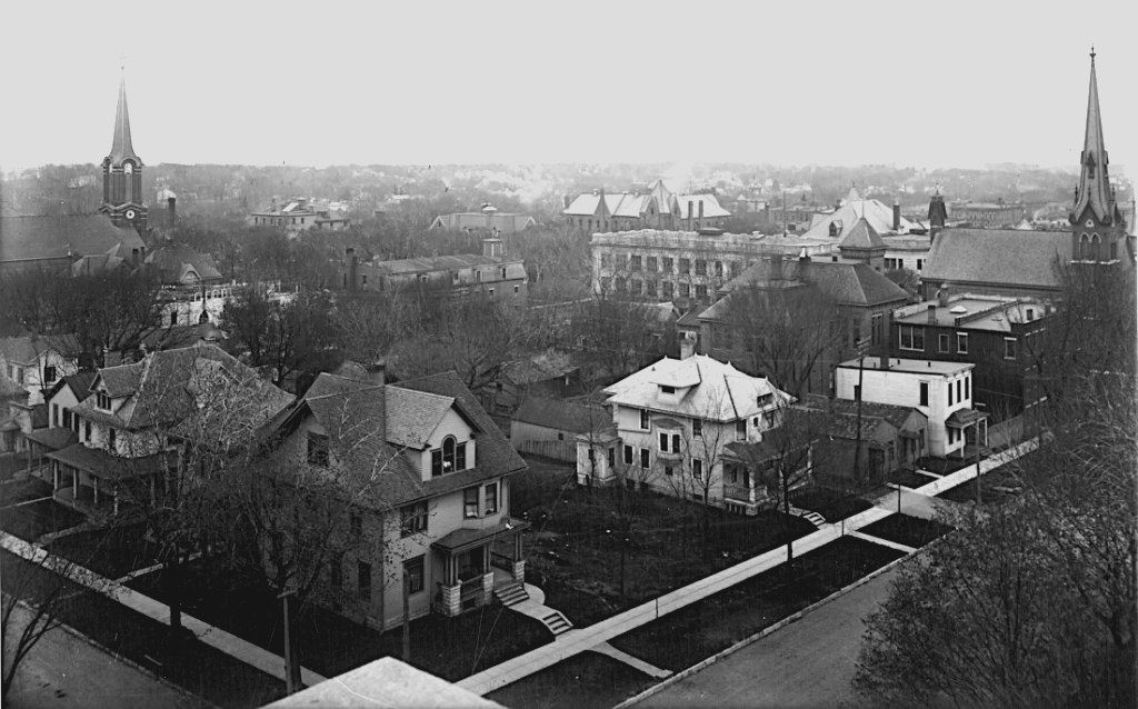 It’s not clear with the current level of research what role the individuals that were members in the First Presbyterian Church played in the major change in Iowa’s attitudes toward involuntary servitude (slavery) that occurred in the decades leading to the Civil War, but since the second building, today’s Old Brick, was not completed until after the end of the Civil War and the limited writings on this period indicating that the congregation met in other places during this time, Old Brick likely played no great part in events surrounding the war or its related events and movements. Incidentally and much later, Professor Samuel Calvin, a Scottish-born geologist, was a member of the church and he took some of the first aerial photographs of Iowa City from the top of the crenelated tower.