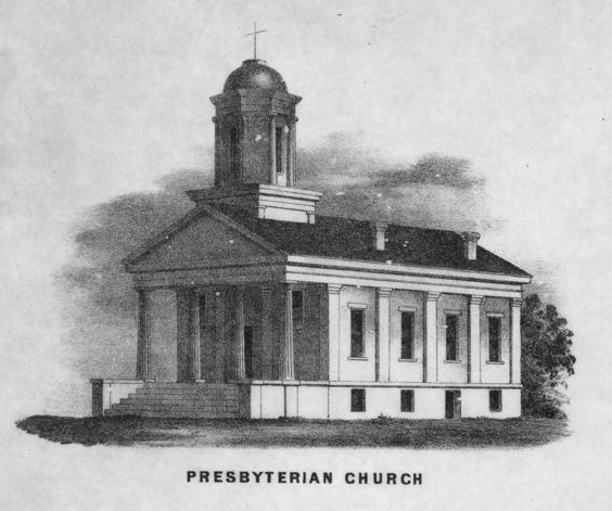 The previous First Presbyterian church was brick clad like the current Old Brick building, but looked substantially different than the current building. It has been described in histories as similar to the contemporary Baptist Church building. A fire caused by a spark from a steam mill destroyed the wooden portions of the building in 1856.